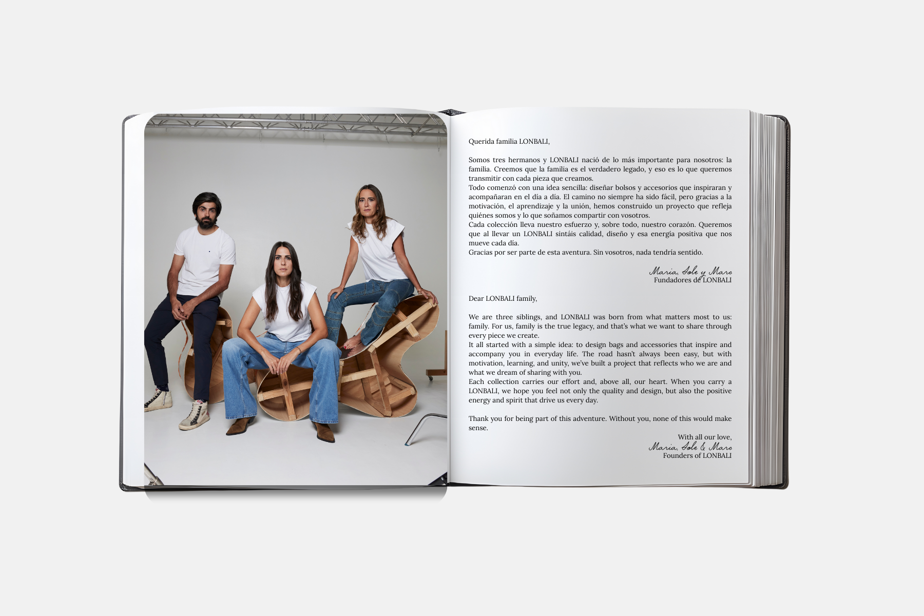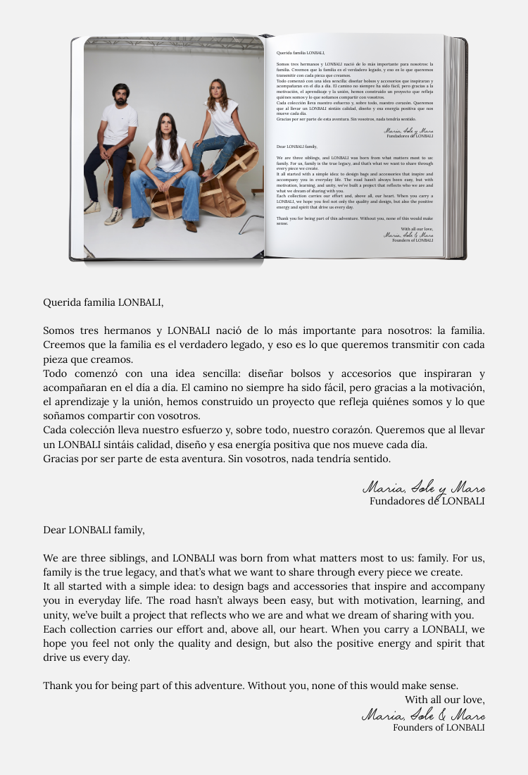 Maria apporte la sérénité et l'ordre ; Sole est l'énergie créatrice pure ; Marc, le plus jeune des trois, est l'équilibre qui relie tout. De cette alchimie naît l'esprit LONBALI: audacieux, fonctionnel et sans limites.