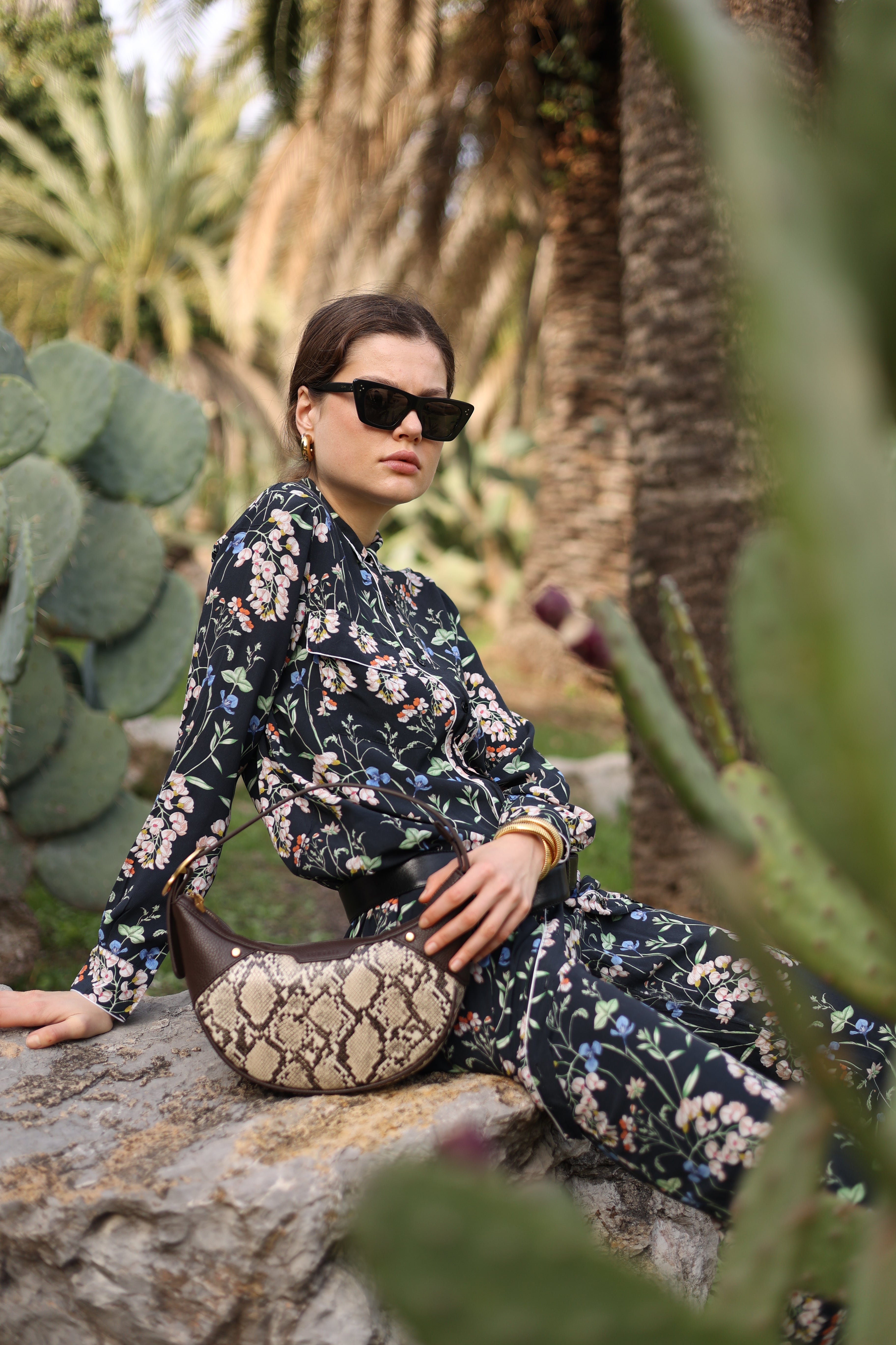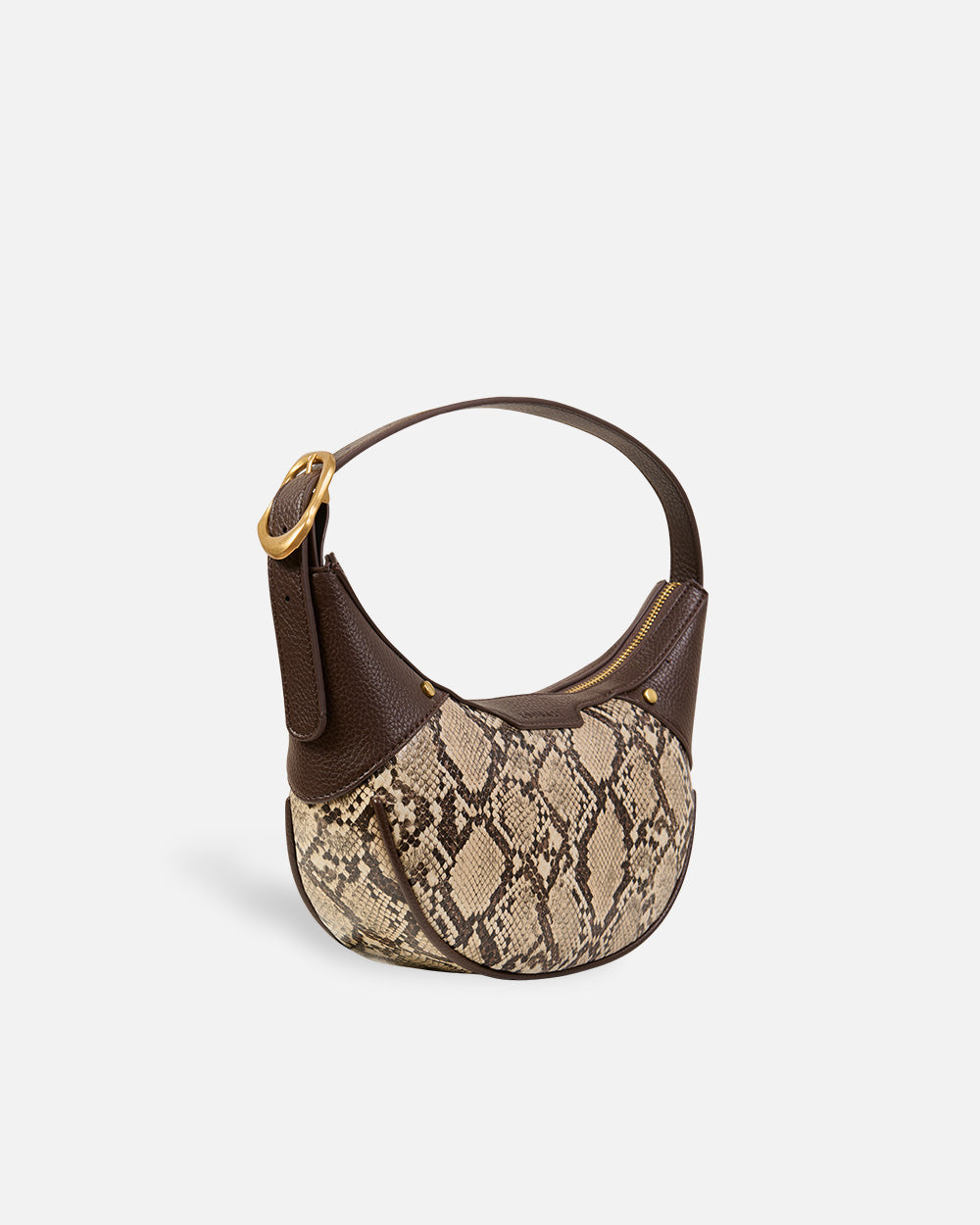 Le sac Halfmoon Snake est un sac élégant au design sophistiqué. Il présente une finition imprimée avec des détails bruns. Il offre un style naturel et unique qui contraste avec l'imprimé du sac. e La forme est structurée mais légèrement flexible, dans une taille polyvalente idéale pour un usage quotidien ou pour compléter des looks plus formels. Il présente des détails tels que des rivets métalliques sur les côtés, qui ajoutent une touche de design fonctionnel.
