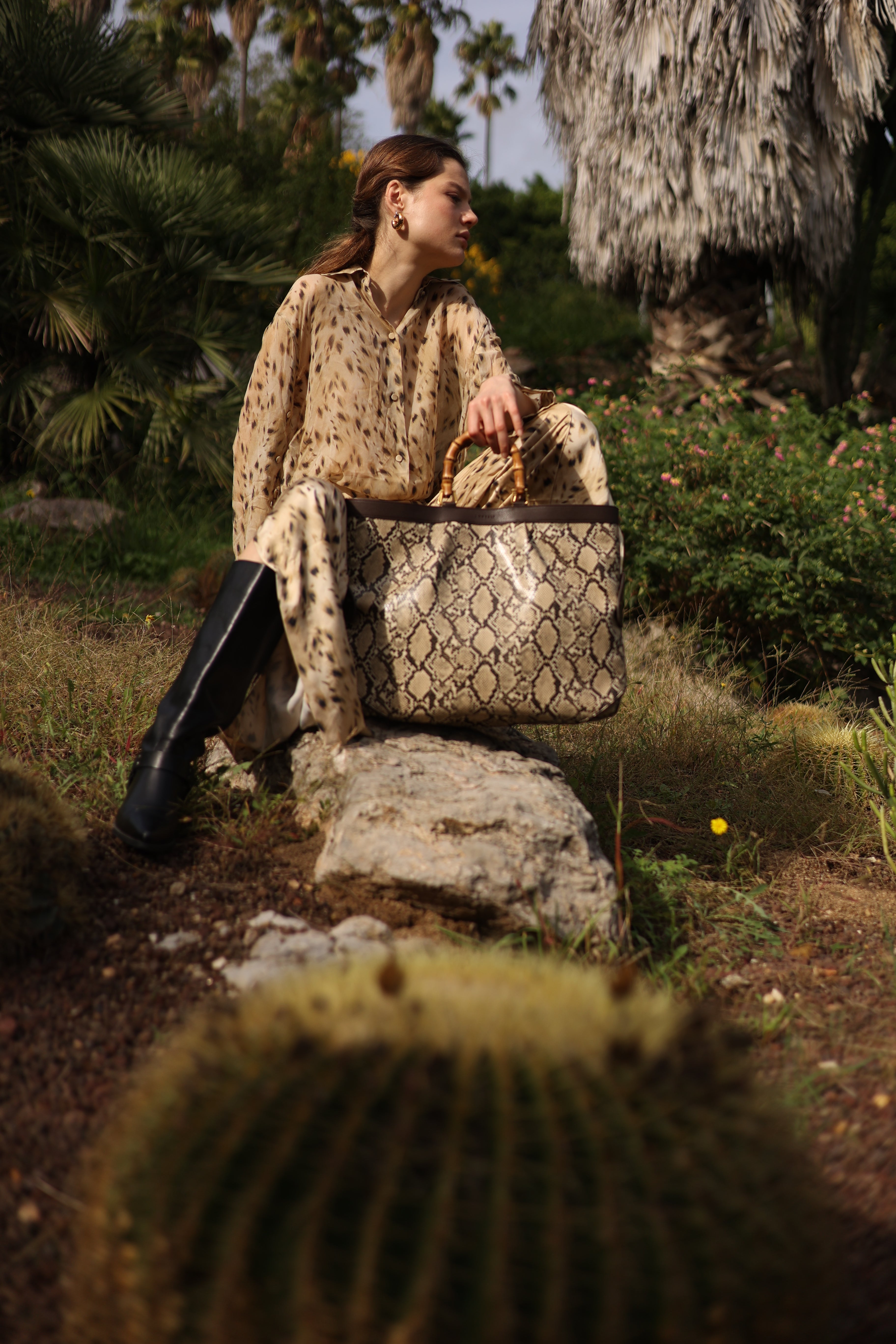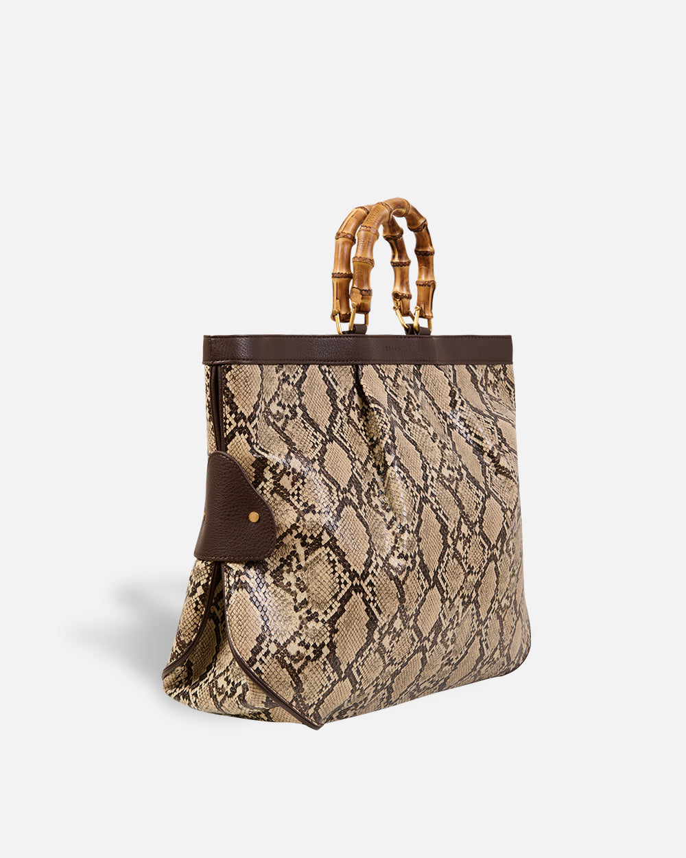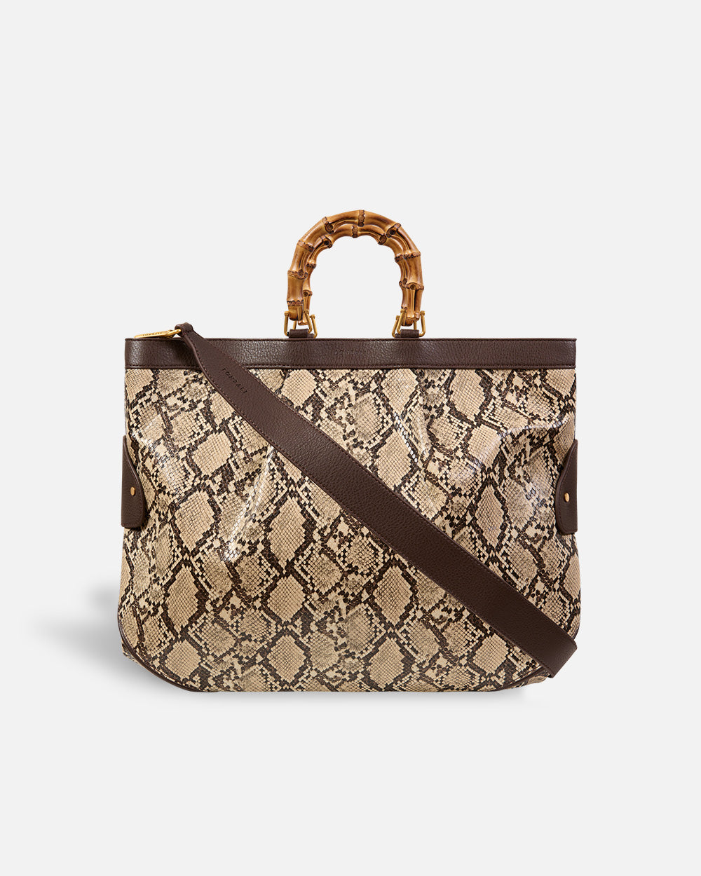 Le Large Tote Snake est un sac pour femme au design sophistiqué. Il présente une finition imprimée avec des détails bruns. Les poignées sont en bambou, offrant un style naturel et unique qui contraste avec l'imprimé du sac. La forme est structurée mais légèrement flexible, idéale pour un usage quotidien ou pour compléter des looks plus formels. Il présente des détails tels que des rivets métalliques sur les côtés, qui ajoutent une touche de design fonctionnel.