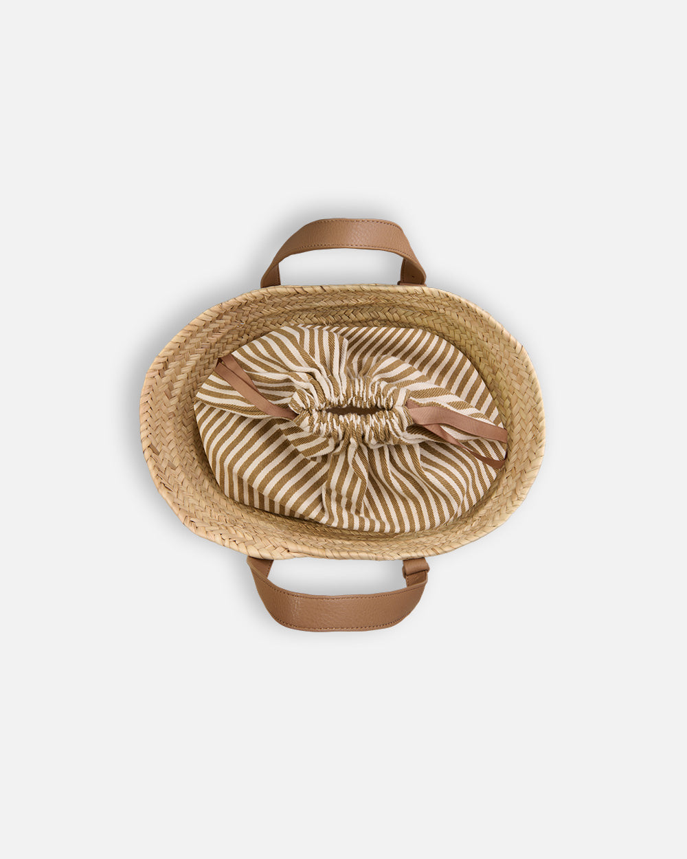 Le détail distinctif est la poche frontale en tissu avec fermeture à glissière, idéale pour ranger vos petits objets en toute sécurité. Le panier est doté d'une solide poignée en cuir pour un transport confortable.