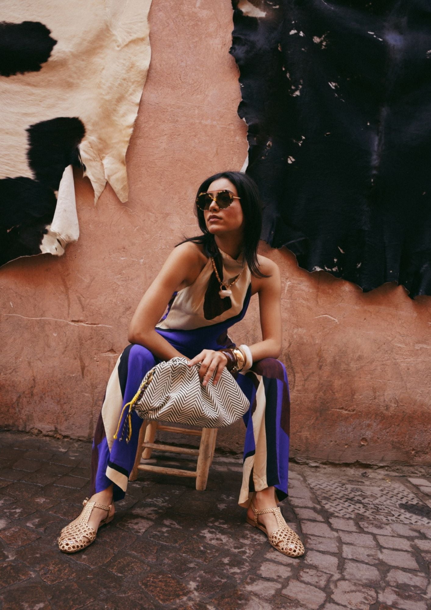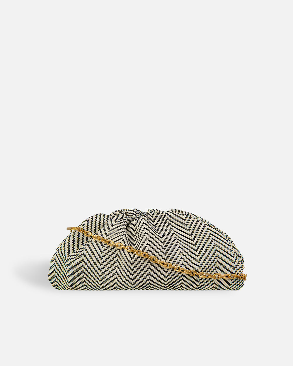 Élégant sac Lonbali à imprimé noir et blanc par Lonbali. Son design structuré et minimaliste, de forme semi-circulaire, en fait l'accessoire idéal pour toutes les occasions. Il est doté d'un fermoir en métal doré de forme organique, qui lui confère un aspect exclusif et moderne, et d'une sangle métallique amovible qui permet de le porter à l'épaule ou à la main.