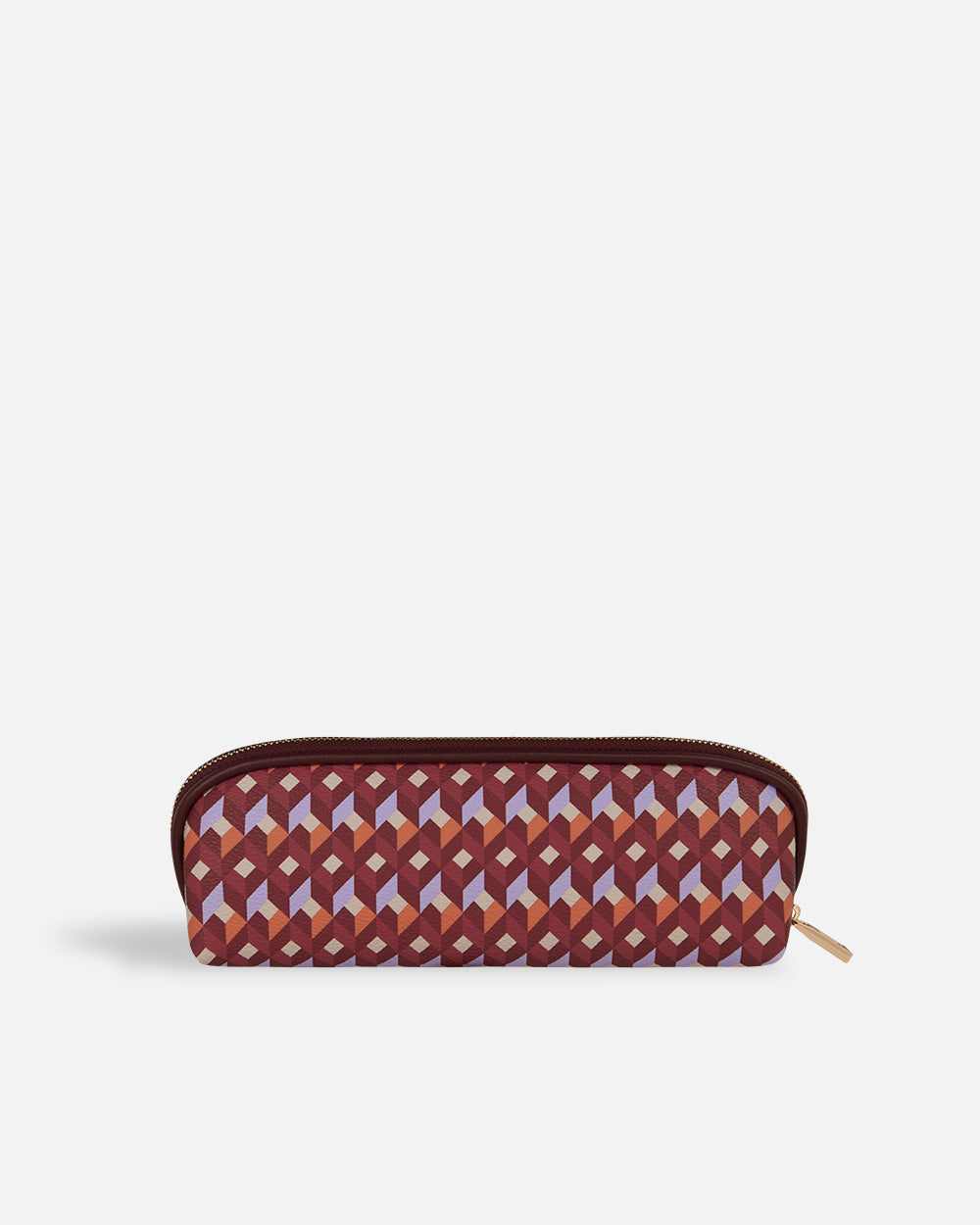 Avec un design géométrique dans les tons bordeaux et lavande, le nouvel étui de Lonbali allie élégance et praticité. Idéale pour organiser des objets personnels ou de la papeterie, elle est dotée d'un fermoir en métal doré et d'une finition de haute qualité.