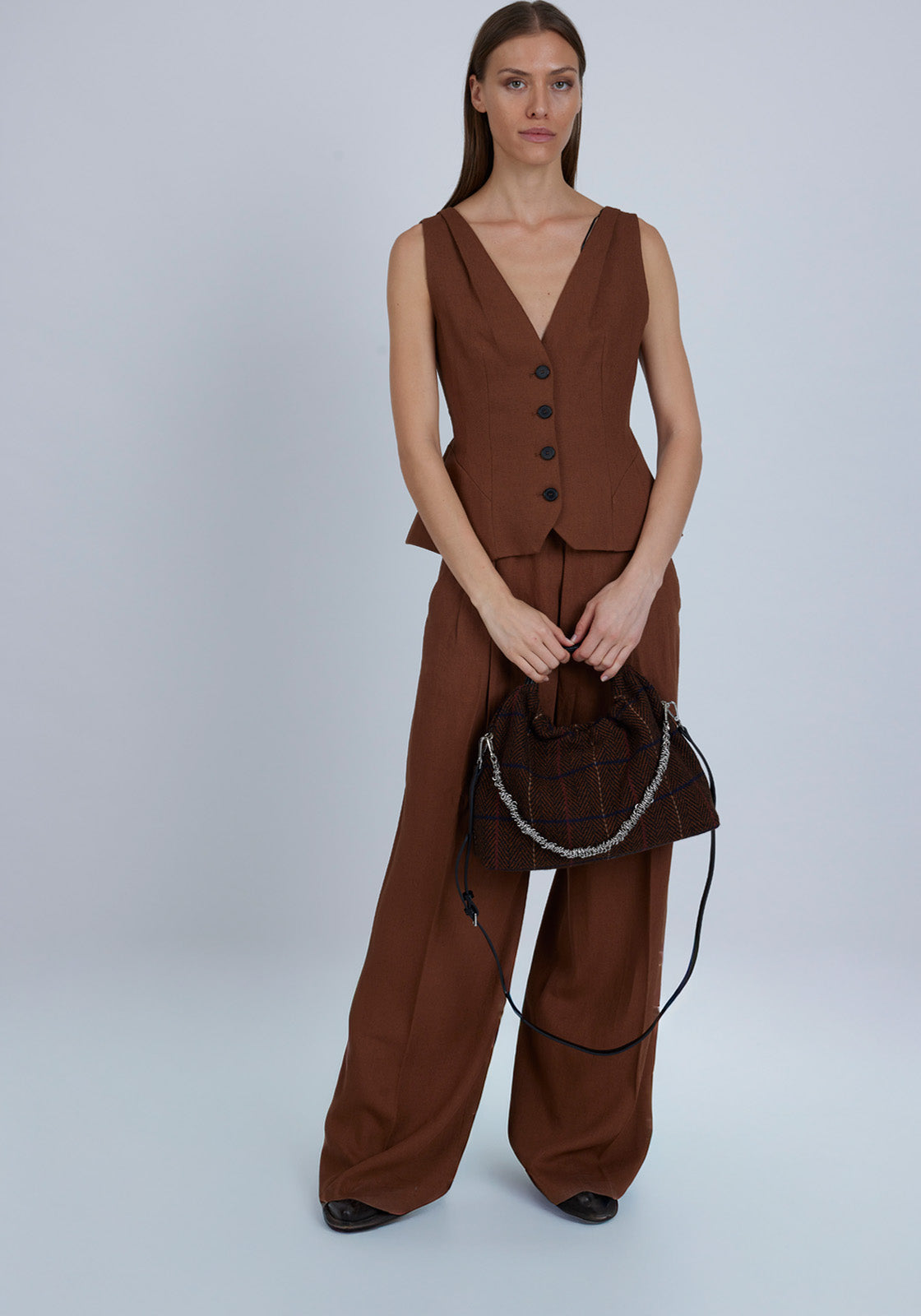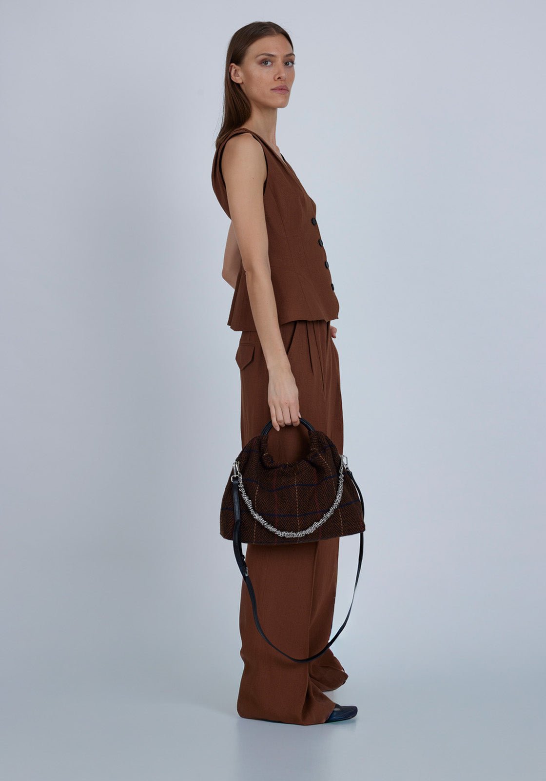 Sa poignée froncée caractéristique lui confère style et confort lorsqu'il est porté à la main, tandis que sa bandoulière amovible, ornée d'une chaîne en métal, permet de le transformer en un sac à main croisé qui ne manque pas de personnalité. Son intérieur spacieux en fait le compagnon idéal pour tous les jours ou pour une soirée élégante.